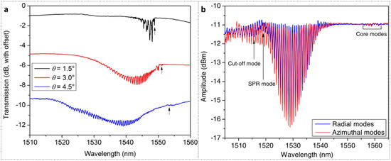 TFBGs have a refractive index modulation direction slightly angled with respect to the optical fiber axis, whose spectrum is normally composed of a core mode and multiple cladding modes [37,72]. The TFBG structural diagram is shown in Figure 10b. The tilt angle determines [73], as described by