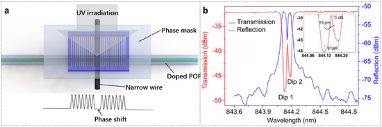 - Pereira, L.M.; Pospori, A.; Antunes, P.; Domingues, M.F.; Marques, S.; Bang, O.; Webb, D.J.; Marques, C.A. Phase-shifted Bragg grating inscription in PMMA microstructured POF using 248-nm UV radiation. J. Lightwave Technol. 2017, 35, 5176–5184. [Google Scholar] [CrossRef] [Green Version]