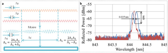 Light guided along the fiber core is scattered by each grating plane. If the Bragg condition is unsatisfied, the reflected light from each of the subsequent planes becomes progressively out of phase and finally cancels out. Oppositely, if the Bragg condition is satisfied, the contributions of reflected light from each grating plane are added up in a constructive manner in the backward direction to form a back-reflected peak with a center wavelength defined by the grating parameters [69]. Such a grating works as a special mirror that reflects light only in a narrow band around the Bragg wavelength , while transmitting other wavelengths. The Bragg wavelength is expressed by: