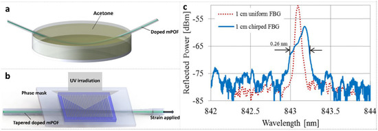- Min, R.; Ortega, B.; Marques, C. Fabrication of tunable chirped mPOF Bragg gratings using a uniform phase mask. Opt. Express 2018, 26, 4411–4420. [Google Scholar] [CrossRef] [PubMed]