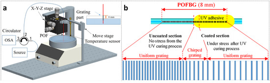- Min, R.; Pereira, L.; Paixao, T.; Woyessa, G.; Hu, X.; Antunes, P.; Andre, P.; Bang, O.; Pinto, J.; Ortega, B. Chirped POF Bragg grating production utilizing UV cure adhesive coating for multiparameter sensing. Opt. Fiber Technol. 2021, 65, 102593. [Google Scholar] [CrossRef]
