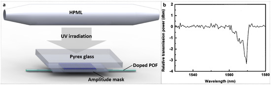 MVK is a kind of photosensitive material, which could be doped in PMMA material as well. The film absorbance spectra of PMMA (cladding material) and P(MMA-co-MVK-co-BzMA) (core copolymer material) are shown in Figure 6a, and the chemical structure of the core material is shown in the inset of Figure 6a [16]. PMMA has negligible absorption beyond 250 nm, and the core material demonstrates considerable absorption in the wavelength range of 250–300 nm.