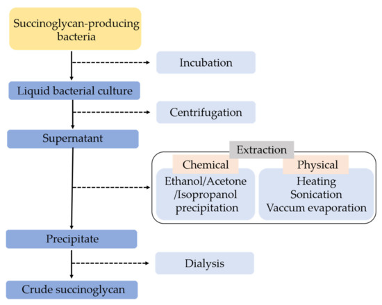 As a bacterial EPS, succinoglycan is found mainly in the Rhizobium, Agrobacerium, Psedomonas species as one of the biofilm components. Some separation and purification methods are required to extract succinoglycan EPS. A description of the procedures for a separation and purification method is illustrated below in Figure 1.