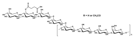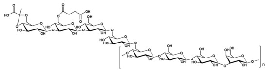 Succinoglycan may have different chemical substituent ratios (pyruvyl, succinyl, acetyl groups) and molecular weight (Mw) depending on the type of strain and the culture conditions for each strain. Rheological properties, such as viscosity and storage/loss modulus, of succinoglycan can be adjusted depending on the measurement conditions (concentration, temperature, pH, etc.). High viscosity in aqueous solution is one of the main characteristics of this water-soluble polymer [84]. It exhibits an order-disorder transition at a characteristic temperature which depends on the ionic strength, counterion, and polymer concentration [85,86,87,88,89,90].