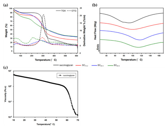 Comparison of the thermal analysis for succinoglycan with different Cr3+ concentrations: (a) thermogravimetric analysis (TGA) and (b) differential scanning calorimetry (DSC). (c) Viscosity change during the first heating cycle of 1 wt.% solution of succinoglycan. Copyright © 2022 by the authors. Licensed MDPI, Basel, Switzerland.