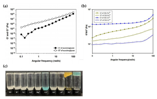 (a) Frequency sweep test of succinoglycan (1 wt.%), (b) Frequency sweep of aqueous succinoglycan solution containing metal ions Fe3+ and Cr3+, and (c) Gelling performance of succinoglycan with respect to the addition of various metal ions: Inverted vial test after mixing various metal ion solutions (0.25 M) with aqueous succinoglycan solution (2 wt.%). Copyright © 2022 by the authors. Licensed MDPI, Basel, Switzerland.