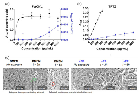 (a) FRAP assay using ferricyanide as oxidant species and ascorbic acid (vitamin C) as positive control (black circles). (b) FRAP assay using TPTZ as the oxidant species and Trolox (water-soluble vitamin E analog) as the positive control (black). (c) Morphologies in the absence of an antioxidant (DMEM) and in the presence of 0.25% FucoPol (+FP) were collected with a 100× magnification. Copyright © 2022 by the authors. Licensed MDPI, Basel, Switzerland.
