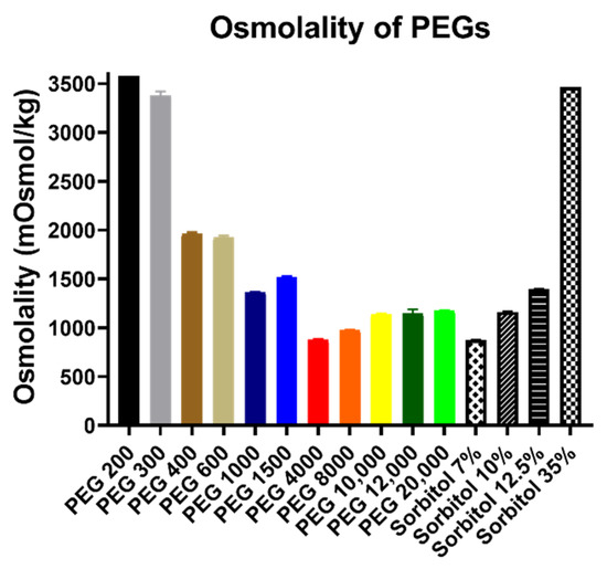 Osmolality of PEG and sorbitol solutions measured by vapor pressure osmometer OSMOMAT 070. Concentrations of all PEG solutions were 30 w/v% and volumes were 1 drop of the solutions each time. Columns represent the mean, ± SEM, n = 4. Osmolality of the samples in mOsmol/kg (mean ± SEM): PEG 200: 3574 ± 0; PEG 300: 3381 ± 38; PEG 400: 1963 ± 17; PEG 600: 1926 ± 17; PEG 1000: 1363 ± 4; PEG 1500: 1515 ± 11; PEG 4000: 877 ± 9; PEG 8000: 977 ± 3; PEG 10,000: 1140 ± 4; PEG 12,000: 1151 ± 38; PEG 20,000: 1174 ± 5; Sorbitol 7 w/v%: 876 ± 2; Sorbitol 10 w/v%: 1164 ± 1; Sorbitol 12.5 w/v%: 1395 ± 4; and Sorbitol 35 w/v%: 3464 ± 0.