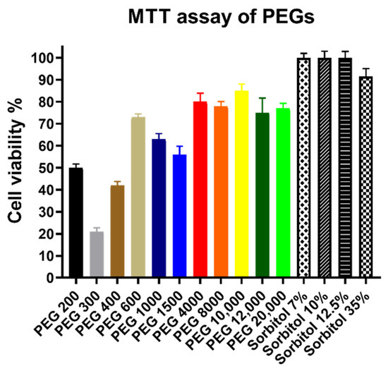 Figure 2 shows that sorbitol solutions did not decrease the cell viability of treated Caco-2 cells according to the MTT assay. However, low molecular weight PEGs such as PEG 200, 300, and 400 severely reduced surviving cells. The other derivatives had less impact on cell viability, yet none of them had higher values than 85% and the results varied greatly regardless of molecular weight.