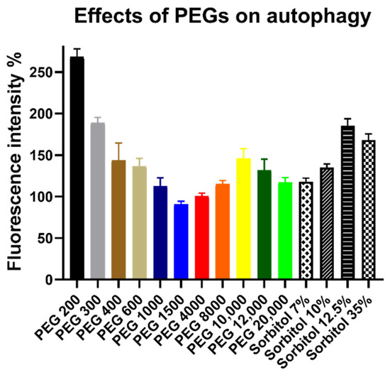 Effect of PEG and sorbitol solutions on the number of autophagosomes. Concentrations of all PEG solutions were 30 w/v% and volumes were 100 µL. Fluorescence intensity is expressed as the percentage of the intensity of the untreated control cells. Columns represent the mean, ± SEM, n = 4, after the highest and lowest values were excluded. Fluorescence intensity of the samples (mean ± SEM): PEG 200: 268% ± 10%; PEG 300: 189% ± 6%; PEG 400: 144% ± 21%; PEG 600: 136% ± 10%; PEG 1000: 113% ± 10%; PEG 1500: 91% ± 4%; PEG 4000: 101% ± 4%; PEG 8000: 115% ± 4%; PEG 10,000: 146% ± 12%; PEG 12,000: 132% ± 13%; PEG 20,000: 117% ± 6%; Sorbitol 7 w/v%: 118% ± 4%; Sorbitol 10 w/v%: 135% ± 5%; Sorbitol 12.5 w/v%: 185% ± 8%; and Sorbitol 35 w/v%: 168% ± 7%.