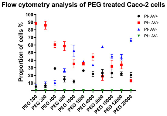 Proportion of living, dead, and apoptotic Caco-2 cells, measured by flow cytometry, treated with 1 mL of 30 w/v% solutions of PEGs, stained with propidium iodide (PI) and annexin V (AV). Each point represents the mean of triplicates. Data represented as percentage distribution of cells between necrotic (PI+ AV+), early apoptotic (PI− AV+), living (PI− AV−), and incorrectly stained (PI+ AV−) populations of three independent experiments. Distribution of the samples as mean ±SEM (PI− AV+; PI+ AV+; PI− AV−; and PI+ AV−): PEG 200: 5.3% ± 1.3%; 88.4% ± 0.6%; 6% ± 1.6%; and 0.3% ± 0.3%; PEG 300: 6.4% ± 2.5%; 86% ± 5.3%; 7.6% ± 4%; and ±0% ±0%; PEG 400: 29.1% ± 0.6%; 60.5% ± 3.7%; 10.3% ± 3.1%; and ±0% ±0%; PEG 600: 14.9% ± 3.7%; 58.5% ± 6%; 26.5% ± 2.4%; and 0.1% ± 0.1%; PEG 1000: 12% ± 2%; 35.1% ± 5.4%; 52.6% ± 7.3%; and 0.2% ± 0.1%; PEG 1500: 26.3% ± 0.7%; 35.5% ± 2%; 38.1% ± 1.2%; and 0.2% ± 0.1%; PEG 4000: 21.9% ± 3.5%; 44.2% ± 4.2%; 33.8% ± 0.8%; and 0.1% ± 0%; PEG 8000: 23.2% ± 4.6%; 18.9% ± 5.6%; 57.8% ± 1.1%; and 0.1% ± 0.1%; PEG 10,000: 22.9% ± 5.5%; 31.8% ± 8.1%; 45.2% ± 2.6%; 0% ± 0%; and PEG 12,000: 22.2% ± 2.5%; 33.8% ± 5.2%; 43.9% ± 3.7%; and 0.1% ± 0.1%.