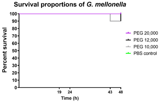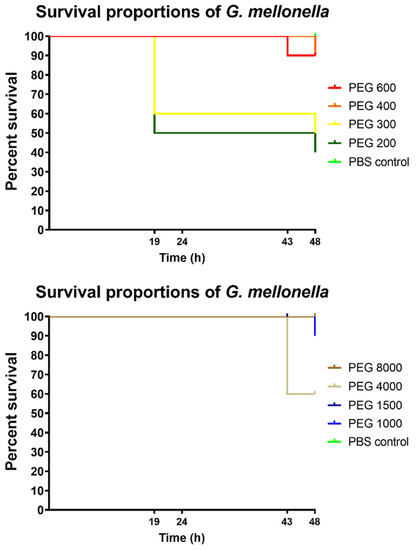 Bugs World Inc. (Budapest, Hungary) provided the larvae of the sixth developmental stage of G. mellonella. Before the treatment, all larvae were kept at 10 °C and in a dark environment. Specimens with length between 2 and 3 cm and lacking any sign of melanisation were placed in sterile vented Petri dishes. Next, 20 µL of the test solutions were injected into the specimens around their last pro-leg with a 29 G needle. Concentration of the test solutions was 30 w/v% for all the PEG solutions. After treatment, the larvae were kept at 30 °C for 48 h shielded from light. Viability was regularly checked by gentle probing with a blunt-ended needle. If no movement was detected after the probing, the given larva was considered to be dead. Viability was observed at 19 h, 24 h, 43 h, and 48 h [14].