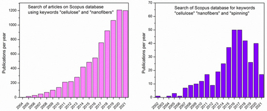 Number of publications per year from database Scopus using keywords “cellulose” and “nanofibers” (left) and refined search including the word “spinning” (right).
