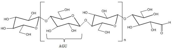 Cellulose is a linear polymer comprised of D-glucopyranose units linked via β-1-4 glycoside bond [1,32]. It is a stereoregular, syndiotactic polymer with highly ordered molecular and supramolecular structure. The macromolecule of cellulose has four hydroxyl (OH) groups on one end, while on the other end, it has a carbonyl (aldehyde) group, which is frequently in the hemiacetal form, and it is the only carbonyl present in the cellulose [33]. Even though it has three hydroxyl groups on each anhydroglucose unit (AGU) (Figure 2), cellulose is not soluble in water, because these groups are involved in intra- and inter-molecular hydrogen bonds, leading to a complex and highly ordered network with a high degree of crystallinity. In fact, this ordered structure causes many common organic solvents to be unable to dissolve cellulose, both totally and partially. The physico-chemical properties of cellulose are highly dependent on the source of cellulose. Table 1 provides some important physico-chemical properties of cellulose based on the source of cellulose [1,17,32].