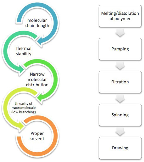Some important properties of polymers for ensuring spinnability and simplified scheme of steps during spinning.