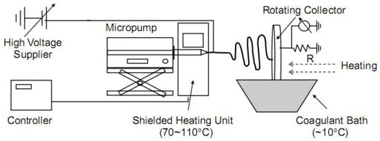 Scheme of the electrospinning system used for production of cellulose fibers (reprinted from Polymer. 2006, 47, 5097–5107, Kim, C.W.; Kim, D.S.; Kang, S.Y.; Marquez, M.; Joo, Y.L. Structural studies of electrospun cellulose nanofibers, with permission from Elsevier).