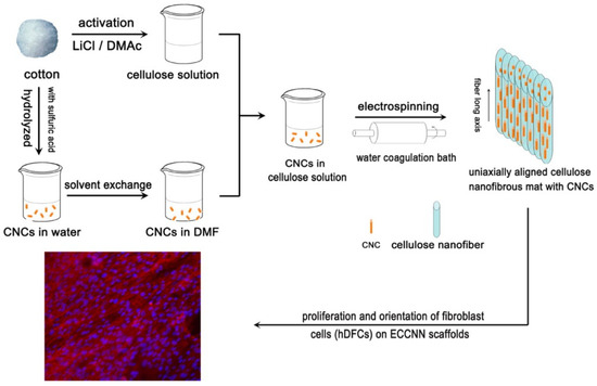 A scheme of the preparation of all-cellulose composite nanofibers from the same source using electrospinning and its potential use as scaffolds (reprinted with permission from He, X.; Xiao, Q.; Lu, C.; Wang, Y.; Zhang, X.; Zhao, J.; Zhang, W.; Zhang, X.; Deng, Y. Uniaxially aligned electrospun all-cellulose nanocomposite nanofibers reinforced with cellulose nanocrystals: Scaffold for tissue engineering. Biomacromolecules 2014, 15, 618–627. Copyright (2014), American Chemical Society).