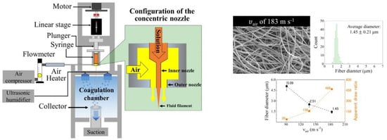 Schematic representation of wet solution blow spinning apparatus of cellulose fibers with mist coagulation chamber (left) and dependency of fiber diameter on air velocity during solution blow spinning (reprinted from the European Polymer Journal, 2020, 125, 109513, Zhang, J.; Kitayama, H.; Gotoh, Y. High strength ultrafine cellulose fibers generated by solution blow spinning, with permission from Elsevier).