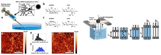 (left) Wet spinning of CNFs. (a) Wet-spinning setup using controlled extrusion with a syringe pump into a THF coagulation bath using NFC and NFCh dispersions, containing surface modifications as depicted in (b) and (c). (d–g) AFM height images for NFC (d) and NFCh (g), as well as their corresponding image analysis concerning the average height of 200 nanofibrils for each class of nanoparticle ((e) = NFC; (f) = NFCh); (right) schematic drawing for the computer-controlled wet-stretching device into which a fiber can be clamped and immersed into a liquid and stretched using controlled strain rates (reprinted with permission from Torres-Rendon, J.G.; Schacher, F.H.; Ifuku, S.; Walther, A. Mechanical performance of macrofibers of cellulose and chitin nanofibrils aligned by wet-stretching: A critical comparison. Biomacromolecules 2014, 15, 2709–2717. Copyright 2014, American Chemical Society).