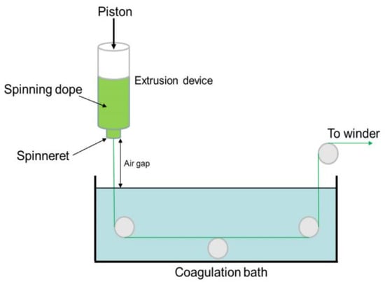 Dry-jet wet spinning is a technique that is essentially similar to wet spinning, but an air gap is added between the spinneret and the coagulation bath (Figure 10) [53].