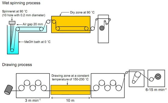 Endo et al. [54] used wet spinning with a small air gap between spinneret and coagulation bath for a production of hybrid filament composed of PVA filled with TEMPO-oxidized nanofibrils (TOCN). The prepared hybrid filament exhibits a high tensile modulus, reaching a value of 57 GPa. The proposed wet spinning and drying scheme is given in Figure 11.
