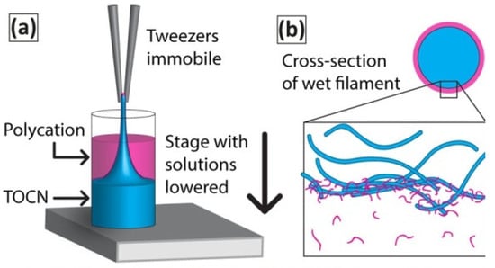 Interfacial polyelectrolyte complex (IPC) spinning of cellulose nanofibers [57] is based on a spontaneous formation of continuous filament upon mechanical drawing of the interface formed by two solutions of oppositely charged polyelectrolytes. The advantage of IPC as the medium used for the process is that it is aqueous and eco-friendly, in addition to the ability of spinning multicomponent filaments. Toivonen et al. [57] prepared TEMPO-oxidized cellulose nanofibrils, TOCN, by spinning anionic TOCN with the polycation poly(diallyldimethylammoniumchloride) (PDADMAC) and chitosan (Figure 12).