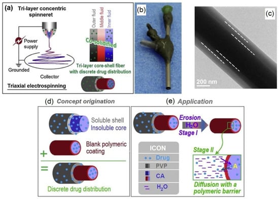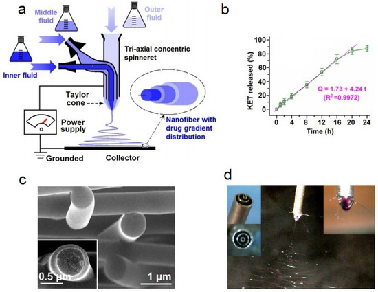- Yu, D.G.; Li, X.Y.; Wang, X.; Yang, J.H.; Bligh, S.W.A.; Williams, G.R. Nanofibers Fabricated Using Triaxial Electrospinning as Zero Order Drug Delivery Systems. ACS Appl. Mater. Interfaces 2015, 7, 18891–18897. [Google Scholar] [CrossRef] [Green Version]