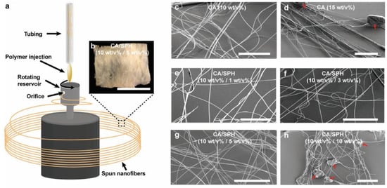 - Wu, J.; Quan, Z.; Zhang, H.; Qin, X.; Wang, R.; Yu, J. Electrospun cellulose acetate nanofiber upscaling with a metal plate needleless spinneret. Mater. Res. Express 2019, 6, 1250e4. [Google Scholar] [CrossRef]