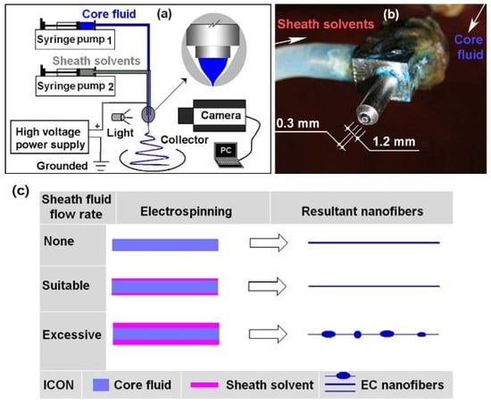 - Yu, D.G.; Li, X.Y.; Chian, W.; Li, Y.; Wang, X. Influence of sheath solvents on the quality of ethyl cellulose nanofibers in a coaxial electrospinning process. Biomed. Mater. Eng. 2014, 24, 695–701. [Google Scholar] [CrossRef]