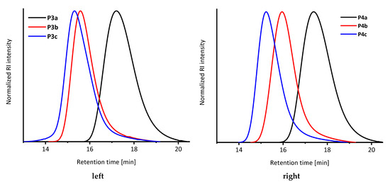 As expected, the molar mass increased within every synthesis step (Figure 1, left; P3a: Mn = 5900 g mol−1, P3b: Mn = 17,800 g mol−1, P3c: Mn = 20,800 g mol−1). All dispersities are very low, indicating a good control over the consecutive polymerizations.