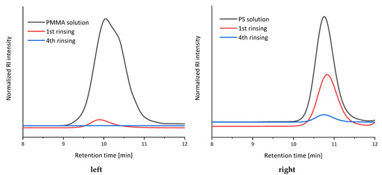 SEC-Elugram of dialysis tubing reusability tests. (left) PMMA (P5) solution. (right) PS (P6) solution. Black: Raw polymeric solution. Red: 1st rinsing fraction. Blue: 4th rinsing fraction.