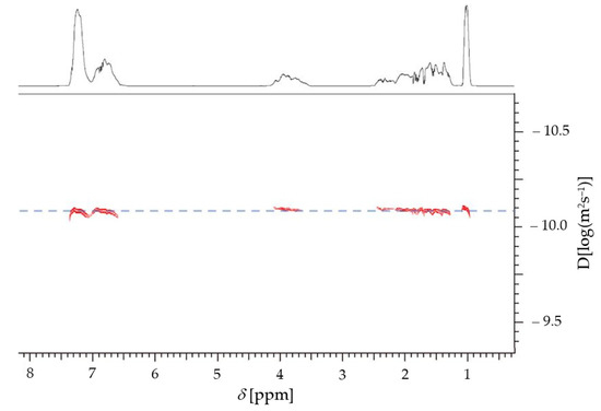 Furthermore, the dispersity of all polymerizations is low (below 1.3), indicating a high control of the polymerizations. To ensure there is only one polymer species, 1H-DOSY measurements were performed with the block copolymer samples (P1b, P2b, P3b, P3c, and P4c, respectively). An example spectrum is shown in Figure 3; all other spectra can be found in the Supplementary Information. As it can be seen, there is only one species in the solution and, thus, the synthesis of the block copolymer was successful for both approaches. All NMR spectra and SEC-curves can be found in the Supplementary Information.