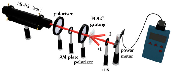 Figure 2 shows the measurement setup of the diffraction signal of the PDLC grating using an unpolarized He-Ne laser beam (λ = 632.8 nm) as the probe beam. The probe beam was converted into a circularly polarized beam through a linear polarizer and a λ/4 plate. A polarizer was placed in front of the sample as an analyzer to select the direction of the linearly polarization of the incident beam. The PDLC cell with the IPS electrode was controlled to form PDLC grating by applying a power supply with 1 kHz AC. An iris and a power meter were placed in sequence behind the PDLC cell. The iris was used to select the diffraction order of the PDLC grating. The power meter (NOVA II, Ophir, Jerusalem, Israel) was used to detect the intensity of the diffraction of the PDLC grating.