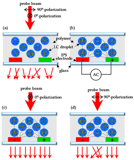Figure 3 shows a schematic diagram and the operating principles of the PDLC grating with the IPS electrode. In Figure 3a, it can be seen PDLCs existed between two glass substrates, and LC droplets or domains were randomly dispersed in the polymer. The direction of the molecules in the LC droplet was random. Since LC the directions were random, the light scattering of the PDLC cell was very strong when the refractive index was not matched. Due to the fact that LC molecules have positive dielectric anisotropy (Δε > 0), when an electric field was applied, the directions of the LC molecules tended to align with the electric field, which caused the LC directions in the droplet cavity to be reoriented by the electric field. The design of the IPS electrode produced a non-uniform electric field, causing the molecular direction of each LC droplet to be non-uniformly distributed with the electric field, as shown in Figure 3b. The electric field at the center of the electrode was perpendicular to the surface of the glass substrate, and the molecular direction of the LC droplets was also perpendicular to the surface of the substrate. Therefore, the 0° and 90° polarization of the incident beam were both subject to the LC ordinary refractive index (no) in the center of the electrode, as shown in Figure 3c,d. Since the ordinary refractive index (no) of the LC and the refractive index (np) of the polymer matched each other, the PDLC at this position became transparent, and the light transmittance was greatly increased. On the other hand, the electric field at the center of the gap between the electrodes was parallel to the surface of the substrate, and the molecular direction of the LC droplets was also parallel to the surface of the substrate, so the 0° and 90° polarization of the incident beam were subject to different refractive indices. When 0° polarization of the incident beam was subject to an ordinary refractive index (no) of the LCs, no matched the refractive index (np) of the polymer, which caused the light transmittance to be increased, as shown in Figure 3c. When 90° polarization of incident beam was subject to the extraordinary refractive index (ne) of the LCs, ne did not match the refractive index (np) of the polymer, which caused a strong light scattering effect to be produced, as shown in Figure 3d. The refractive index of the LCs that were subject to 90° polarization from the electrode gap to the electrode center was between ne and no. When the PDLC cell generated spatially periodic scattering and non-scattering distributions, which resulted in a difference in the transmission intensity of the incident beam, the grating was formed. The refractive index of the LC that was subject to 0° polarization from the electrode gap to the electrode center was no. Because it matched the refractive index (np) of the polymer, the incident beam was directly transmitted without scattering, as shown in Figure 3c.