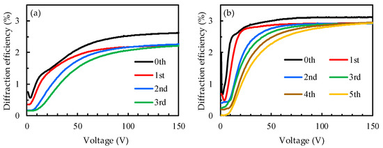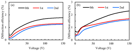 Figure 6 shows the diffraction efficiency of two PDLC gratings with different IPS designs with a probe beam of 90° polarization. The cell gaps of the two samples were both 15 μm. Figure 6a shows the experimental diffraction efficiency results with the IPS electrode width and spacing of 15 μm and 15 μm, respectively. When the voltage was increased to 100 V, the diffraction efficiency of the zeroth order reached the limit and the diffraction curve tended to be flat; moreover, the highest diffraction efficiency was 1.8% when the voltage was 150 V. The diffraction efficiency here is defined as the ratio of the transmitted intensity to the incident light intensity. As the voltage increased to 80 V, the first-order diffraction efficiency curve tended to be flat. The first-order diffraction efficiency at voltage = 150 V was 1.3%. The second-order diffraction efficiency also increased to a limit value as the voltage increased, and the diffraction efficiency curve became flat under high voltage. Figure 6b shows the experimental results of the diffraction efficiency with an IPS electrode width and spacing of 10 μm and 10 μm, respectively. The diffraction efficiency from the zeroth order to the second order became stronger as the voltage increased, and the diffraction efficiencies from the zeroth order to the second order, at a voltage of 150 V, were 2.3%, 1.7%, and 1.6%, respectively. The maximum applied voltage limit of the IPS electrode used in this experiment was 150 V. If this voltage was exceeded, the sample would have been destroyed. Therefore, the maximum applied voltage of all samples was only 150 V. The design of the IPS electrode could generate a horizontal electric field parallel to the surface of the glass substrate. When comparing the experimental results of Figure 6a,b, in the two IPS electrode designs, it can be seen that the experimental results of the electrode with a width and spacing of 10 μm and 10 μm were better. It is speculated that because the electrode spacing of 10 μm was relatively small, a relatively large lateral (horizontal) electric field could be generated at the same voltage, resulting in the better performance of LCs that were driven, and thus, the resulting diffraction efficiency could be relatively high. In addition, the sample thickness of the 15-μm cell gap shown in Figure 6 was too thick, so the lateral (horizontal) electric field generated by the IPS electrode could not drive the upper LC droplets of the sample, and thus, the orientation of the upper LC droplets of the sample was random. Therefore, the scattering of PDLC in the upper layer of the sample affected the diffraction performance of the grating.