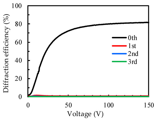 Figure 8 shows the diffraction efficiency of the PDLC grating with a cell gap of 5 μm, as a function of voltage, using an incident beam of 0° polarization. It can be observed from the figure that the diffraction efficiency of the zeroth order increased significantly with the increase in voltage, and the highest diffraction efficiency was 81.8% at the applied voltage of 150 V. In contrast, the diffraction efficiency from the first to the third order did not increase significantly. This result conforms to the mechanistic principle described in Figure 3. When the voltage was applied to the PDLC cell with an IPS electrode, the incident light beam of 0° polarization was only subject to the refractive index (no) of LC where no matched the refractive index (np) of the polymer, and thus, the light transmittance could be increased. Therefore, the transmittance of the incident beam with 0° polarization increased strongly, and the diffraction intensity of the zeroth order also increased significantly. However, the diffraction of other orders involved only a weak diffraction signal generated by the mismatch of the refractive index of the PDLC and the ITO electrode, so there was no obvious diffraction effect due to the increase in the applied voltage.