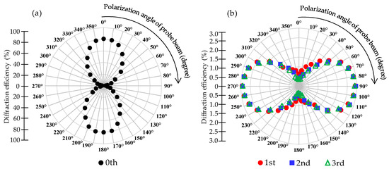 Figure 9 shows the polarization analysis of each order diffraction of the PDLC grating at an application voltage of 100 V. The cell gap of the sample used for this measurement was 5 μm and the applied voltage was fixed at 100 V. The second polarizer (analyzer) of the experimental setup shown in Figure 2 was rotated to change the polarization direction of the probe beam, and the polarization angle changes took every 10° as a unit. Every time the polarization direction of the probe beam was changed by 10°, the diffraction efficiency of each order was recorded. The polarization direction of the probe beam is indicated on the angular axis of the polar coordinates in Figure 9. The divergence axis of polar coordinates represents the efficiency of diffraction, recording the diffraction efficiency of each order. Figure 9a shows the measured diffraction efficiency of the zeroth order diffraction as the polarization angle of the probe beam changed. The highest diffraction efficiencies could be obtained in the directions of 0° and 180°, while relatively small diffraction efficiencies were obtained in the directions of 90° and 270°. The above results indicate that the zeroth order diffraction belonged to linear polarization, and the polarization direction was in the directions of 0° and 180°. Figure 9b shows that the diffraction efficiencies of the first order to the third order varied with the polarization direction of the probe beam. From the experimental results in the figure, it can be seen that the diffraction efficiencies of the first to third order diffraction in the directions of 90° and 270° were relatively high, while the diffraction efficiencies in the directions of 0° and 180° had minimal values. The results indicate that the first to third order diffraction belonged to linear polarization, and their polarization directions were in the directions of 90° and 270°. It is estimated that the polarization directions of other high-order diffractions were also 90° and 270°. When the applied electric field was turned on, there was a strong correlation between the diffraction intensity and the polarization direction of the probe beam. The polarization direction of the zeroth order diffraction was perpendicular to the polarization directions of the other orders.