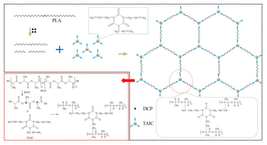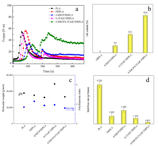 - Firstly, the crosslinked structure was proved to be formed. Compared with FRPLA, the increase (307%) of torque and the decrease (77.8%) of melt flow rate verified that the addition of 0.9%DCP and 0.3%TAIC could form the effective crosslinked structure. The results of gel content test showed that there was a synergistic cross-linking effect between DCP and TAIC, and the gel content of 0.9DCP/0.3TAIC/FRPLA reached 30.8%, which was the highest among all the PLA composites. Compared with FRPLA, the molecular weight of 0.9DCP/FRPLA decreased by 7.5%, and the molecular weight of 0.3TAIC/FRPLA increased by 39.6%, which verified the catalyzed chain breaking effect of DCP and the chain extender effect of TAIC.