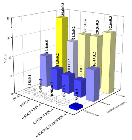- Secondly, the formation of crosslinked network structure could improve the mechanical properties. The tensile strength, elongation at break and the impact strength of 0.9DCP/0.3TAIC/FRPLA increased by 34.8%, 82.6% and 42.9%, respectively, which were the highest among the PLA and FRPLA composites.