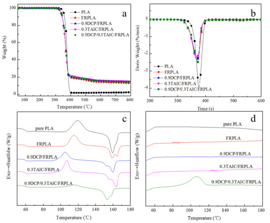 - Finally, the TGA test results showed that the introduction of cross-linked structure can effectively improve the formation of final carbon residue. The DSC test results showed that a obvious crystallization peak can be observed on the cooling curve of 0.9DCP/0.3TAIC/FRPLA at the cooling rate of 10 °C/min, and the crystallinity was as high as 22.6%. It indicated that the addition of 0.9% DCP and 0.3% TAIC could increase the crystallization rate and promote the crystallization of PLA.
