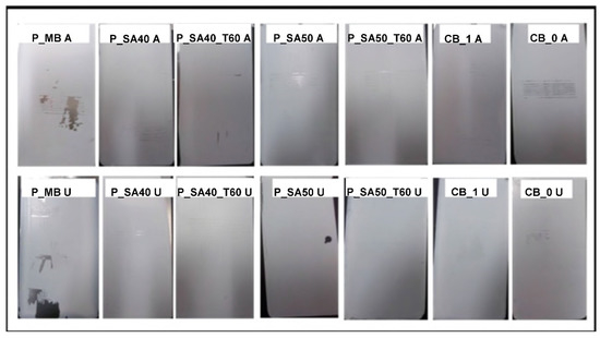 It is well known that the basic features in order to design an efficient waterborne paint for corrosion protection are adhesion, barrier protection and flash rust resistance; for this reason, the assessment of these properties are presented below. Namely, adhesion resistance, flash rust resistance, high humidity, and weathering tests were performed for all of the paint formulations. Table 4 presents the adhesion test results for paints based on MB, SA40 and SA50 latexes dried at 296 and 333 K (P_SA40 and P_SA50 dried at 296 K and P_SA40_T60 and P_SA50_T60 dried at 333 K) and CB (CB_0 and CB_1), applied onto steel substrate, cleaned with the previously mentioned procedures (A and U).
