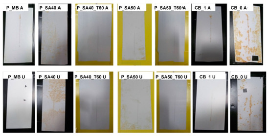 An accelerated corrosion test (i.e., salt spray test) was also carried out, and Figure 8 shows the result of coated steel panels after 240 h of exposure to the 5 wt% NaCl fog. Since the cleaning procedure of the steel surface did not show particular difference in the previous paint tests, just the procedure A was carried out.