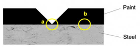 Scheme of the cross section of the coated specimens. Note: SEM-EDX analysis was carried out at (a) the scribe and at (b) non-scribed region.