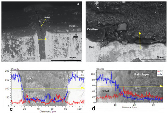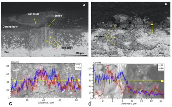 SEM micrographs with EDX linescan (c,d) of the cross-section of P_MB U coated specimens at (a) the scribe and at (b) no-scribed region. Red and blue spectra correspond to O and Fe, respectively.