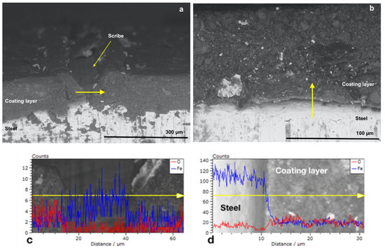 SEM micrographs with EDX linescan (c,d) of the cross-section of P_SA40_T60 U coated specimens at (a) the scribe and at (b) no-scribed region. Red and blue spectra correspond to O and Fe, respectively.