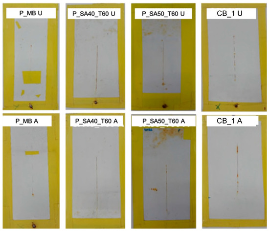 The high humidity resistance test is referred to constant climate conditions. However, it can be combined with repetitive cyclic variations in temperature, humidity or even radiation. For instance, irradiation with UV is primarily used to assess the photochemical resistance of the binder system. However, it may also give a good account on the overall resistance of the entire coating against weather, when combined with humidity [44,45]. A weathering cycling test substantially attempts, more closely than the high humidity test, to simulate the outdoor conditions (non-marine) in a laboratory environment (closely controlling levels of humidity, UV level, and temperature) and it is recommended for paint coatings being used in typical (non-marine) atmospheric conditions exposure. As it can be seen in Figure 7, MB and SA40_T60 and SA50_T60 based paints (substrate cleaned with procedure A or U) performed similarly to the commercial DTM benchmark CB_1 (with corrosion inhibitors in the formulation), but without the addition of any corrosion inhibitors. Notably, the performance of paints based on the binders prepared in this work was similar to the commercial one, which indicates that they were able to provide at least the same protection coverage under cyclic and prolonged corrosion conditions similar to the outdoor exposure.
