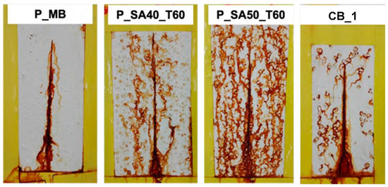 On the contrary, P_SA coats dried at 60 °C showed poor performance in salt spray as coated specimens underwent severe corrosion after 240 h of exposure. This result was not expected especially since the bare binders’ films presented a better performance (+800 h in salt spray test, compared to 400 h for MB binder; see the Supplementary Materials section) and lower salty water uptake than the rest of the binders. Admittedly, we do not have an explanation for this inconsistency in the salt-spray test of the binders and the paints formulated from these. However, it is worth recalling, as discussed in the introduction, that formulating a paint is a complex and sophisticated technique that relies in trial-and-error. Furthermore, it is known that small changes in the binder composition might require substantial adjustments in the formulation of the optimal paint.