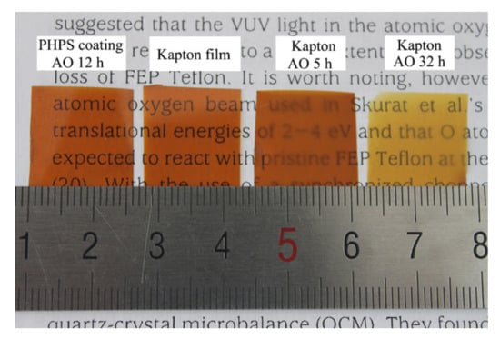 - Hu, L.; Li, M.; Xu, C.; Luo, Y.; Zhou, Y. A polysilazane coating protecting polyimide from atomic oxygen and vacuum ultraviolet radiation erosion. Surf. Coat. Technol. 2009, 203, 3338–3343. [Google Scholar] [CrossRef]