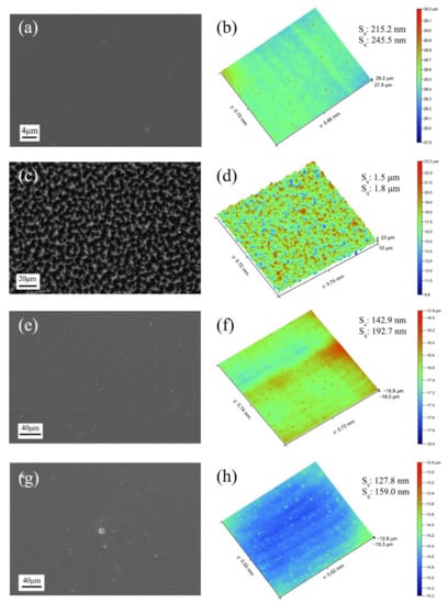 Surface morphologies of (a) Kapton, (c) Kapton after AO exposure, (e) as-prepared PHPS coating and (g) PHPS coating after AO exposure (Total fluence of AO exposure: 1.5 × 1021 atoms cm−2) and corresponding 3D morphologies of each sample were displayed aside in (b,d,f,h), respectively.
