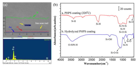 Chemical composition of the PHPS coating tested by (a) EDS line scan and point scan and (b) FTIR.